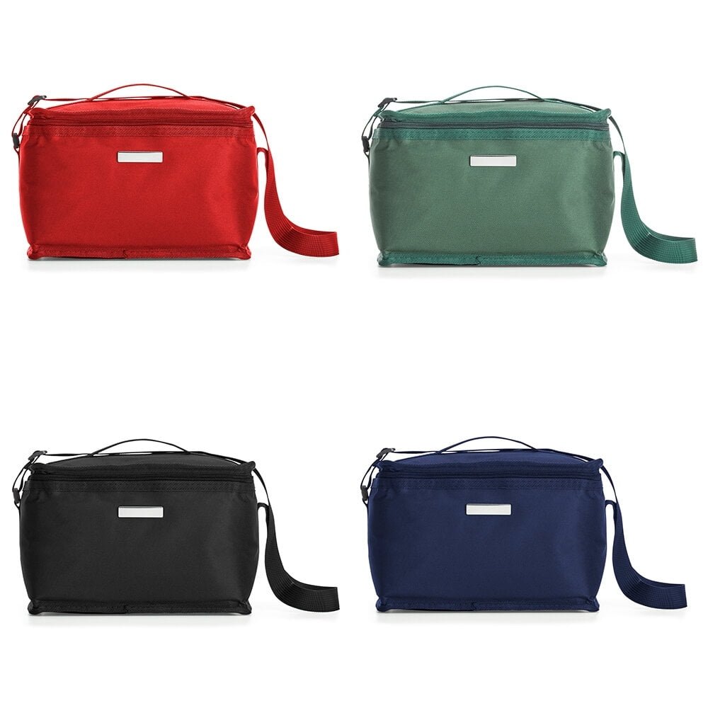 Bolsa térmica 8 litros em nylon com bolso traseiro externo de malha, duas alças para mãos, sendo uma delas ajustável. Parte interna com revestimento térmico, acompanha plaquinha para personalização avulsa.