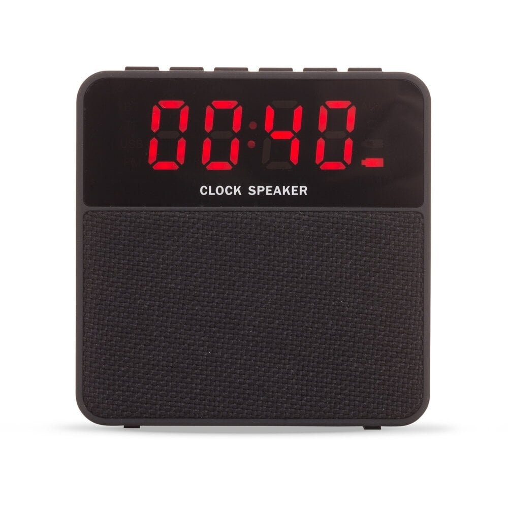 Caixa de som bluetooth multifunções com relógio digital. Material emborrachado com display superior frontal, tela de proteção dos falantes em tecido, parte inferior com borrachas anti-deslizantes. Possui botões de Relógio/Alarme; Telefone/Atender chamadas; Mode; – retroceder/diminuir; + avançar/aumentar; Play/Pause/Troca; Microfone; Botão on/off; Entrada auxiliar P2; Entrada DC 5V; Entrada USB e Entrada TF (cartão MicroSD). Funções: botão Relógio/Alarme – ao pressioná-lo ele irá entrar em modo de ajuste, neste modo quando pressionado novamente ele finaliza o ajuste. Ao segurá-lo ele ativa/desativa o bluetooth, caso ajuste o horário do alarme e ele ficar congelado, segurar este botão para voltar ao horário normal; botão Telefone – quando conectado através do bluetooth basta pressionar este botão para atender e desligar a chamada; botão M/Mode – alterna entre os modos bluetooth, rádio FM(basta conectar o cabo na entrada DC 5V para utilizar com antena, após isto pressionar o botão play e irá começar a sintonizar automaticamente), entrada de aúdio auxiliar (pode ser conectada no computador), pen drive e cartão de memória MicroSD; botão – – ao ser pressionado retrocede a faixa ou estação, no modo relógio diminui a contagem, nos modos com música ao ser segurado irá abaixar o volume; botão + – ao ser pressionado avança a faixa ou estação, no modo relógio aumenta a contagem, nos modos com música ao ser segurado irá abaixar o volume; botão Play/Pause/Troca – no modo relógio ao ser pressionado irá mudar a seleção do ajuste(ficará piscando aonde será ajustado), caso o alarme não esteja tocando basta segurar este botão para resetar as configurações e irá funcionar normalmente. Nos modos com música serve de play e pause. Bluetooth V 4.2; Distância de alcance 10 metros; Voltagem DC 5V; Recarga aproximada de 2 à 3 horas; Falante 4Ω3W; S/N ≥95db; Frequência de Resposta 280HZ-16KHZ; Potência da bateria 1200mA. Acompanha cabo USB e manual chinês/inglês.