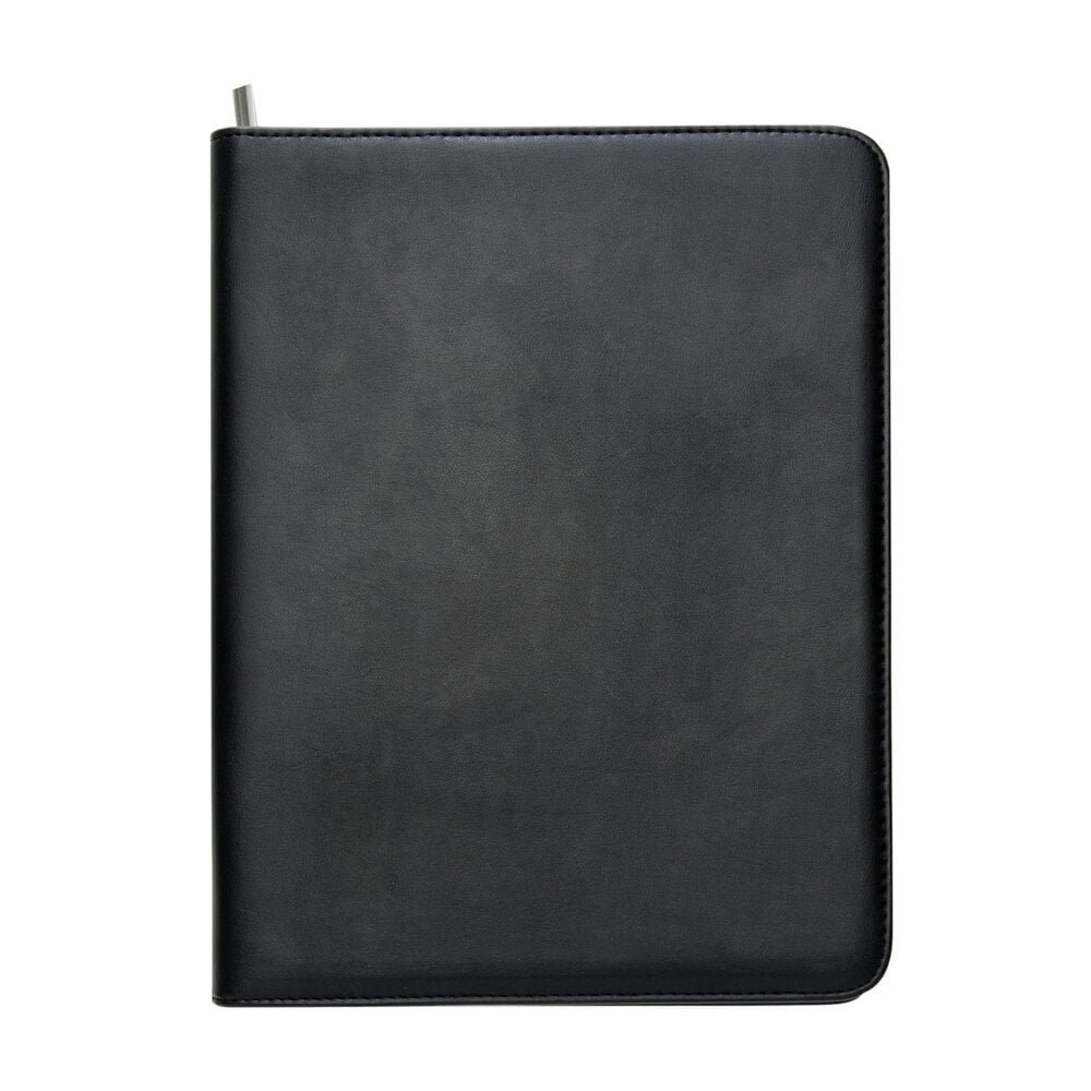 Pasta convenção de couro sintético, possui calculadora solar plástica de 8 dígitos, suporte para cartão, suporte com visor para cartão de identificação, suporte para arquivar documentos, suporte para caneta(não acompanha caneta) e bloco com 20 folhas pautadas.